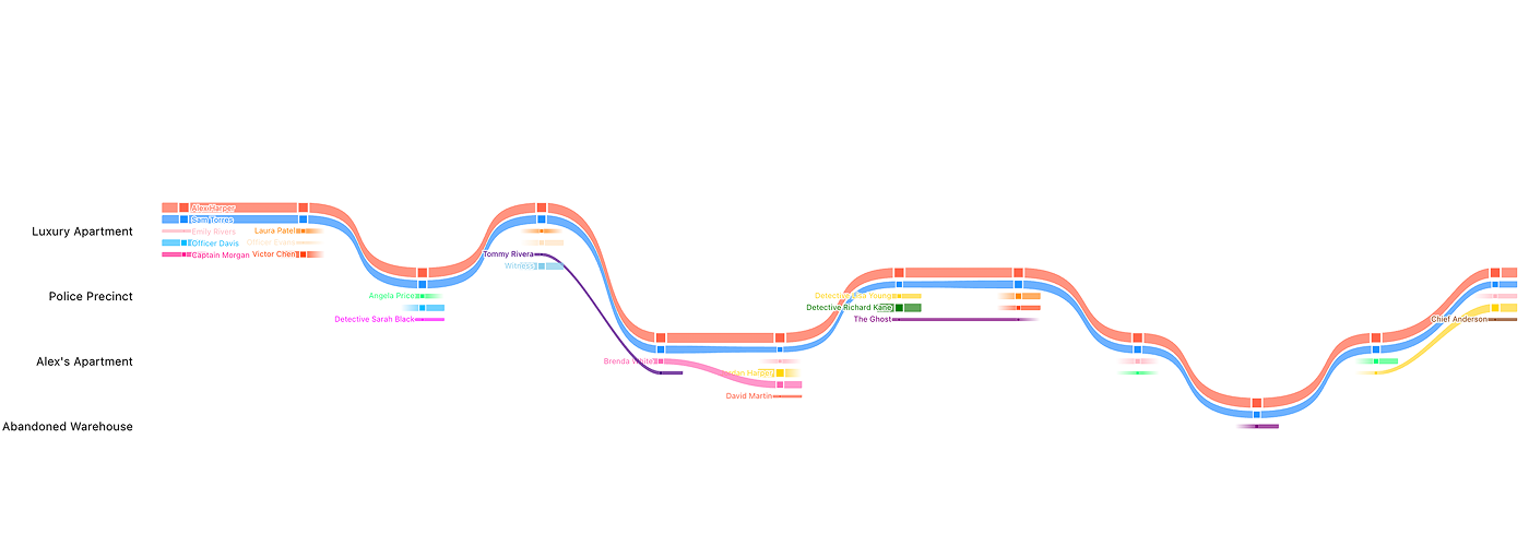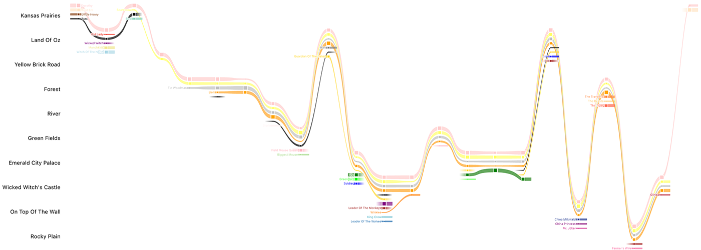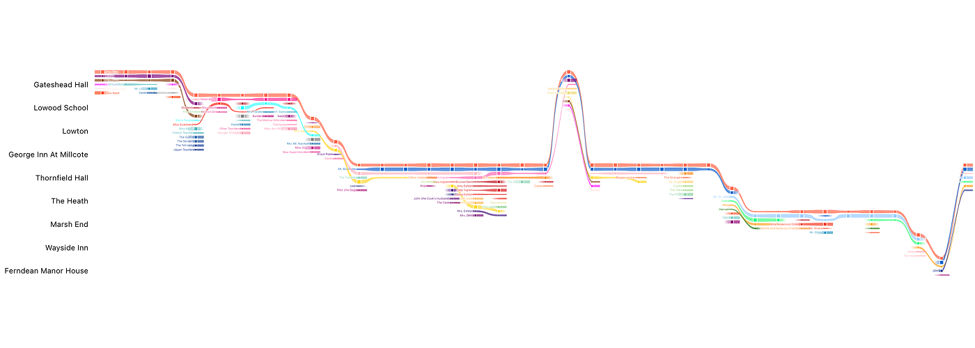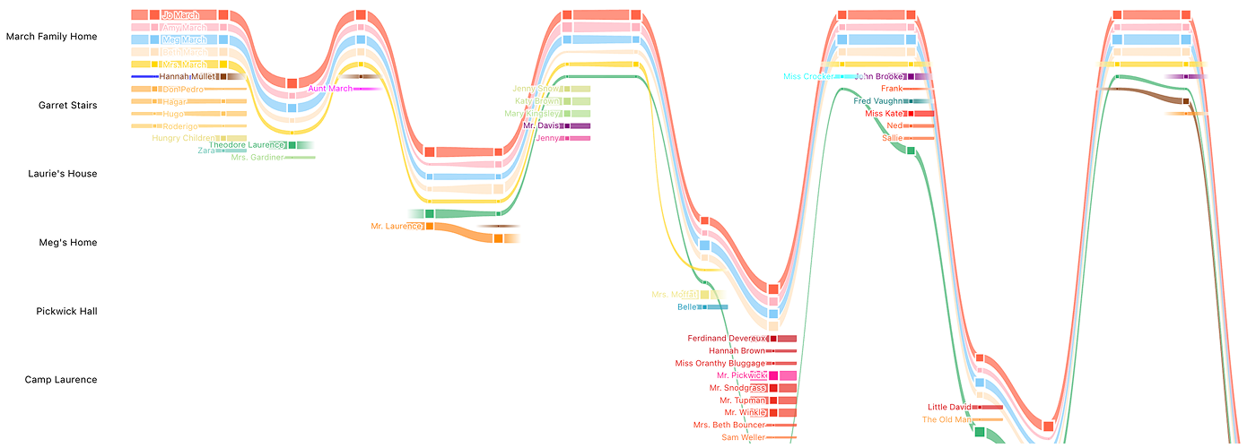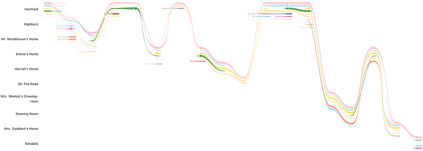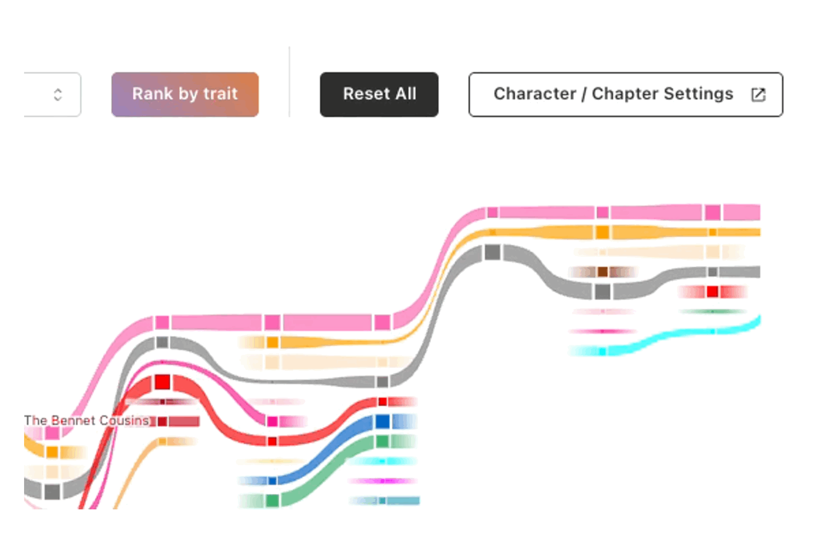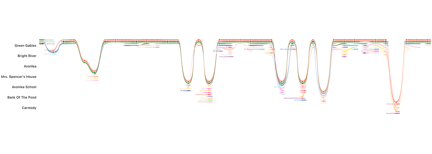 Story Ribbons visualizes narrative insights from our LLM-powered analysis pipeline, allowing users to explore customizable character and theme trajectories for 36 stories. Each "ribbon" represents a different character in Pride and Prejudice (e.g., Elizabeth Bennet), and can be used to track interactions across novel chapters (x-axis) and locations (y-axis). We use ribbon thickness to represent character prominence in each chapter. Chapter titles are colored by sentiment (red: positive, blue: negative).