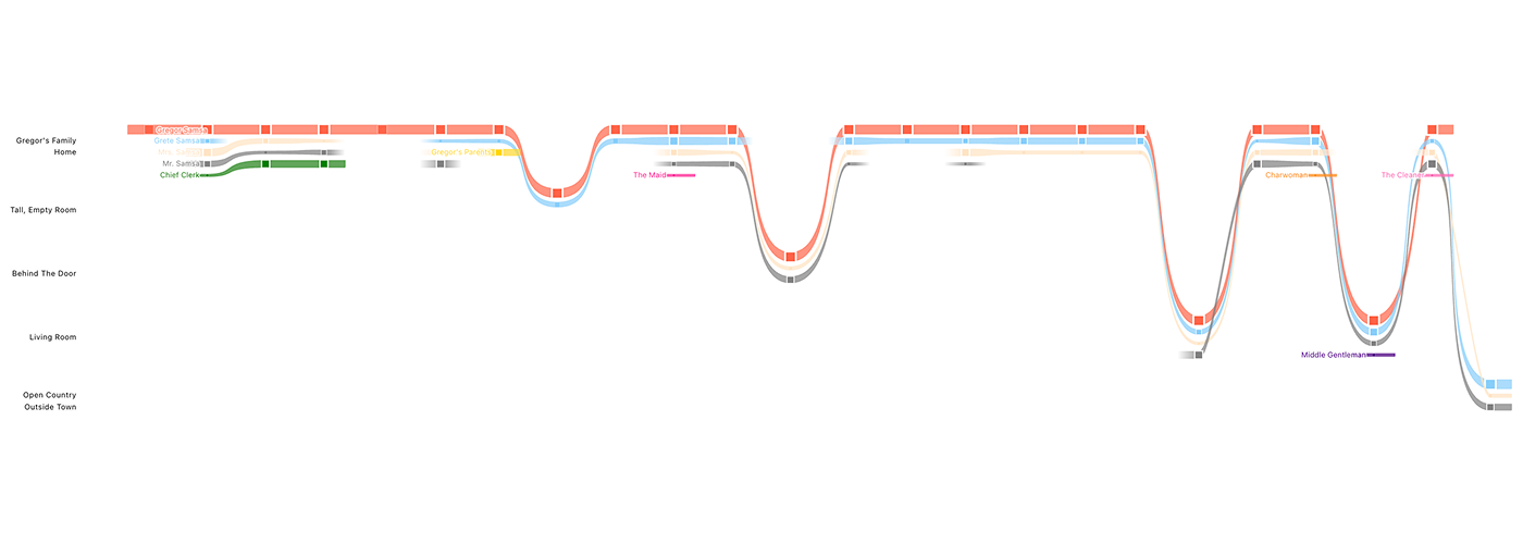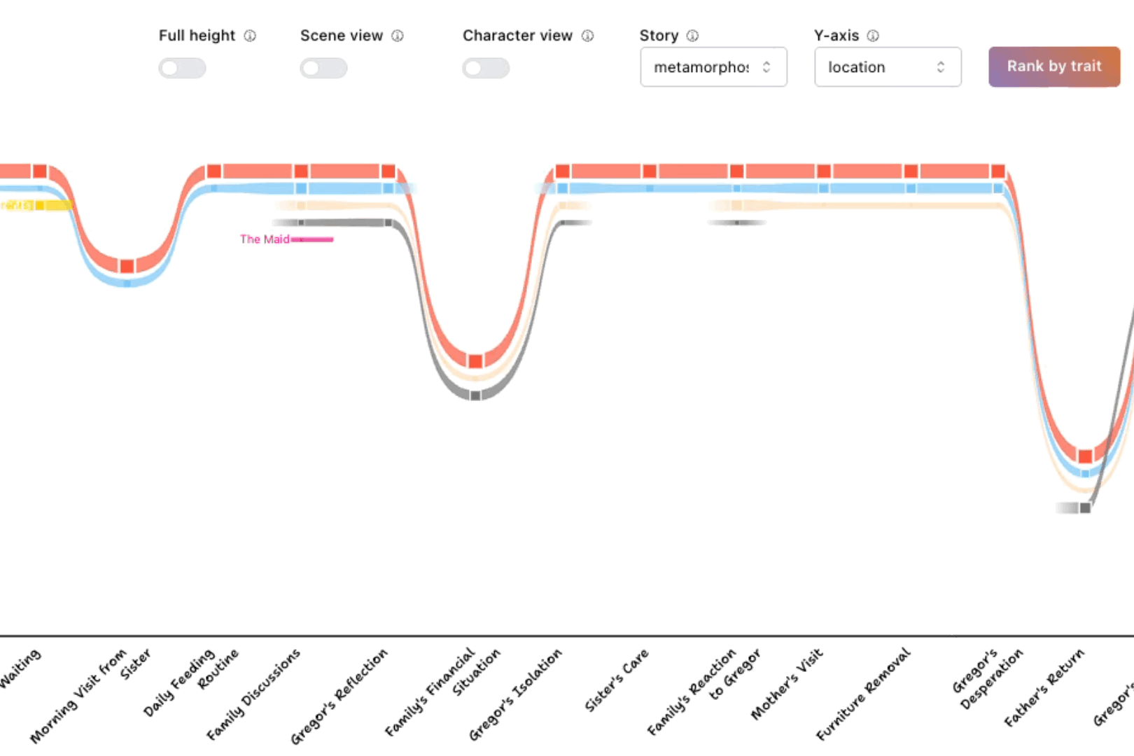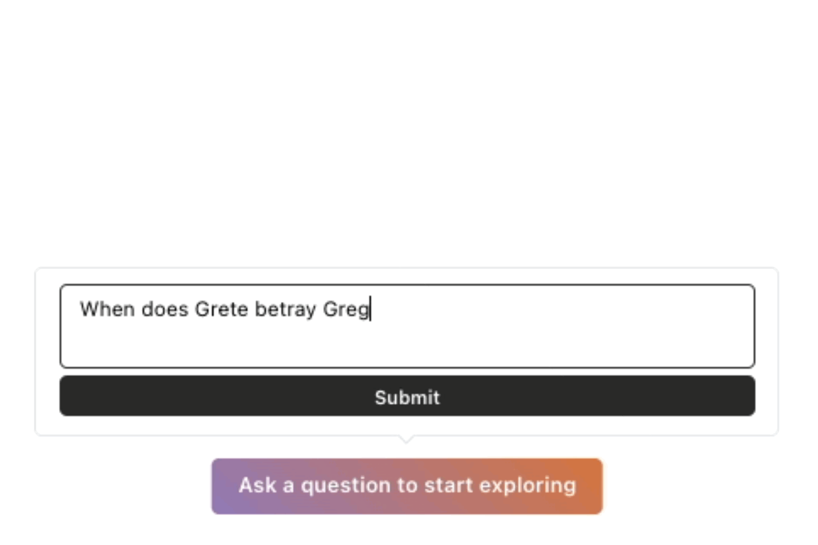 Help users navigate the visualization and gain deeper story insights by providing personalized guidance based on their natural language queries (e.g., "When does Grete betray Gregor?").
